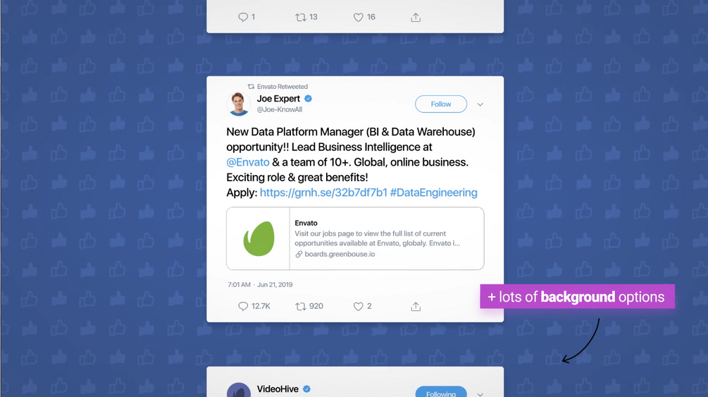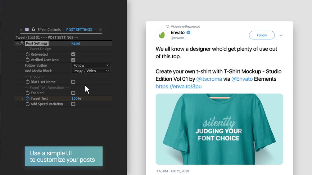 Animated Social Posts This is an After Effects Template which you can use to visualize different things that politicians, celebrities or other influencers say online. You can recreate a vector social media post (Facebook, Instagram and Tweet) and then animate it using one of the pre-animated scenes.